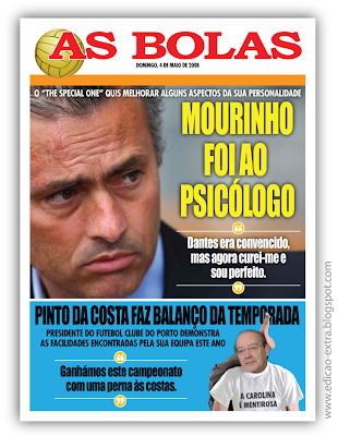Bruno, o Porto ganhou o campeonato com as 2 pernas atrás das costas e não com uma! A noticia do Mourinho está excelente, só falta mesmo o aumento da cabeça por o chelsea ter chegado à final da liga dos campeões. Nem quero imaginar se o chelsea for mesmo campeão europeu! acho mesmo que ele fecha-se em casa e inflige castigos a ele próprio tipo Opus Dei!
